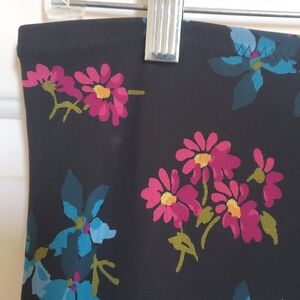 Black with flowers in hues of magenta pink and teal blue, olive green foliage. Flirty ruffle hem in contrasting polkadot print. Elastic waist. Waist 28" Length 23" (skirt hits at knee and the ruffle fluid around a bunch when you walk :) Stretchy lightweight fabric, fully lined. Excellent condition.