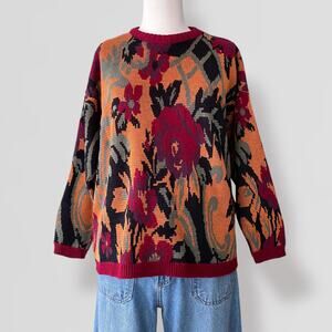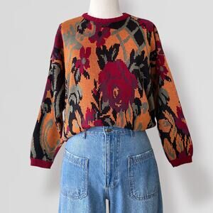 Vintage 90s Earthy Fall AOP Sweater Intarsia Crew Neck Cottage Artsy Boho Made In USA