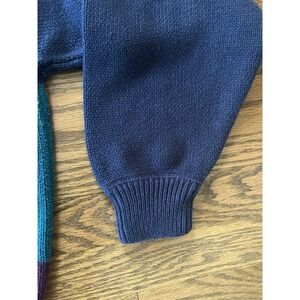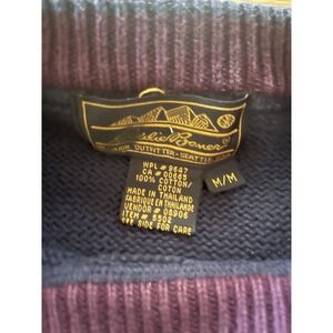 The Vintage 90s Eddie Bauer Color Block Sweater is a stylish and cozy piece for men in size medium. This chunky-knit sweater features a classic crew neck and long sleeves, perfect for casual occasions in the winter and fall seasons. Made from cotton, this multicolor sweater with a striped pattern is a great addition to any 90s-themed wardrobe. The pullover style and vintage charm make it a versatile and comfortable option for outdoor activities like walking and hiking.
