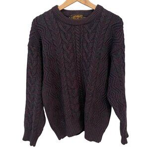 Classic Eddie Bauer men’s cable knit sweater in a rich multicolor yarn blend with deep green, burgundy, and charcoal tones. Features a traditional crew neckline, heavy textured knit, and a timeless outdoorsy aesthetic that works well for casual wear, layering, or vintage-inspired looks. Comfortable, substantial feel with a relaxed classic fit.