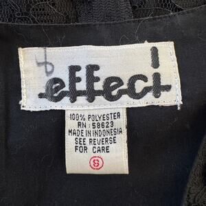 This beautiful vintage ‘90 Effeci vest features black lace in a floral design adorned with small beads, a V-neckline, button closure, and adjustable back tie.