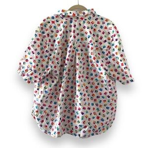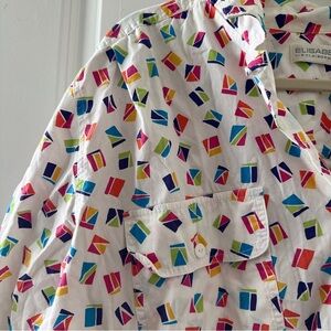 Rare and unique vintage 90s white short sleeve button front shirt in a colorful geometric pattern, almost like an abstract nautical/sailing flags. Relaxed fit, comfy, looks great solo or layered.