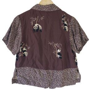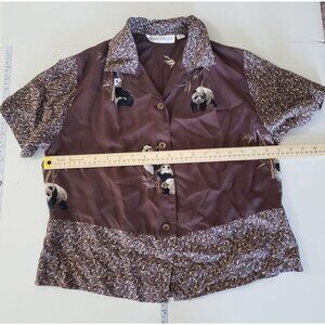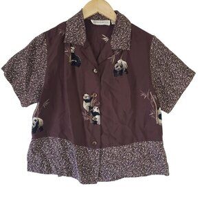 Vintage 90s Elyse Hart Brown Panda Print Button Up Short Sleeve Blouse Size S