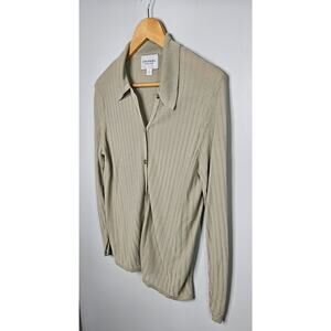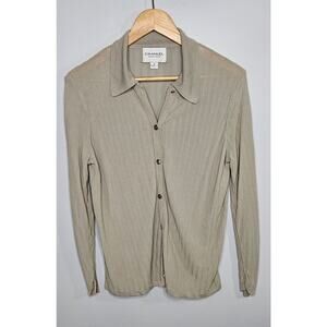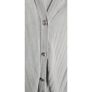 Vintage 90s Emanuel Ungaro Women's Ribbed Knit Cardigan Sweater - Size Medium - Beige Tan - Mother of Pearl Buttons - Semi Sheer Rayon Knit - Made in USA