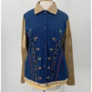 Vintage 90s Jean Jacket Embroidered Pattern Corduroy Sleeve