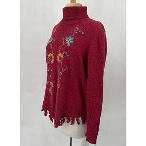Vintage 90s Embroidered Sweater Turtleneck Fringed Tassels Hem Maroon Red