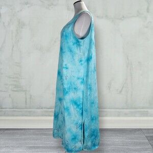 Vintage 90's. Pullover sleeveless midi length dress with double side slits in a twill fabric, tie dye with floral embroidery at hem, unlined, does not stretch.