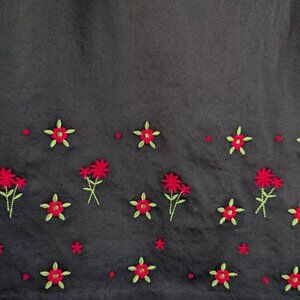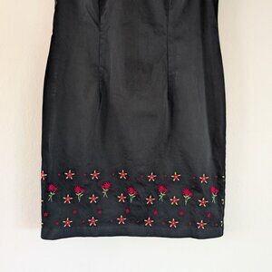 Cute vintage 90s little black dress with dainty red flowers embroidered along the hem. Short sleeveless poplin shift dress with darts at chest and rear zipper closure. Lightweight poplin with timeless and flattering silhouette.