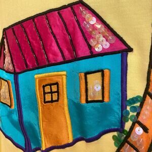 Patchwork and sequin design of palm tree, beach shack, and the words “island fever” along bottom
