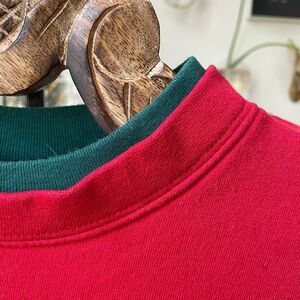 Vintage endless designs layered look red sweatshirt with dark green layer at the collar. The front is embroidered and appliquéd with an apple tree, using different techniques and fabrics. No size or fabric content tag, but laying flat measures approximately 25 inches shoulder to him and 22 inches armpit to armpit. based on those measurements, I think it is equivalent to a modern size large but please double check measurements to ensure the proper fit for you. Perfect for an arborist or teacher.