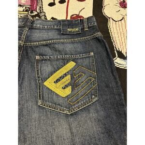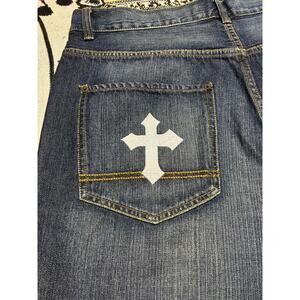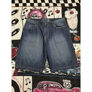 Vintage 90s Enyce Jean Shorts Baggy Custom Embroidered Size 38 Cross Denim Y2K