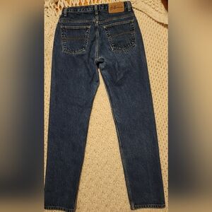 Classic Indigo rigid denim (non-stretch) in great pre-owned condition. No holes or stains. High rise, straight leg, slight taper. These fit slim, somewhat relaxed, and don't have that odd, dumpy look that some of the vintage "mom" jeans have. Very similar feel and fit to older Levi's 501s, or 505s.