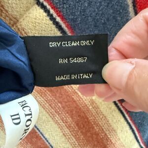 Vintage 90s Express oversized blanket, print blazer style pea coat. Acrylic, polyester and wool blend. Acetate and rayon lining. Made in Italy. Whip stitch edges. Shawl collar and two button closure. Blue, tan, beige, terra-cotta orange and red. Laying flat measures 32 inches shoulder to hem and 20 inches armpit to armpit. Please note that based on these measurements this is roughly going to fit up to a modern size large, but it is meant to be oversized. Two large bucket pockets at the hip that button closed.