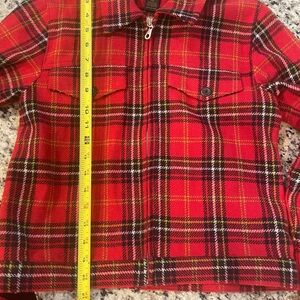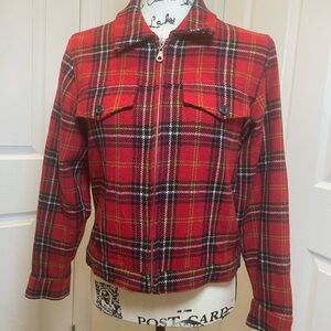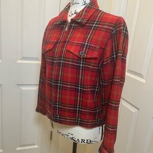 This Express trucker jacket showcases a striking red and black tartan pattern, perfect for adding a bold touch to your wardrobe. Its cropped design and long sleeves offer a modern and versatile style for casual outings. Crafted from comfortable fabric, it ensures both style and ease of movement.iconic 90’s vintage wool blend Plaid Zipped