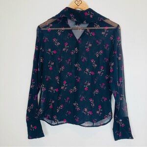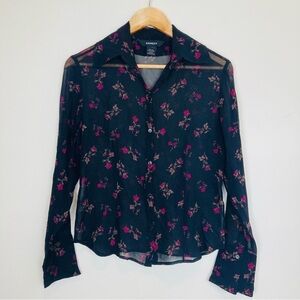 Vintage 90s Express sheer black silk button front rose print top. Size 5-6