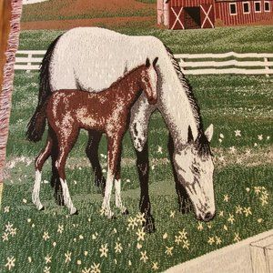Vintage 90s Farm Horse Barn Fringe Tapestry Blanket 65 X 44 Mare Colt.