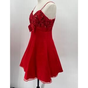 Keywords: red cocktail dress sequin fit and flare party dress evening lace tulle lining 90s vintage cocktail party bow crinoline A line a line bows made in usa american vintage semiformal semi formal hoco homecoming vtg retro glam glamorous feminine vibrant eye catching cherry red colorful bold vintage silhouette satin embroidered lace sequined 1990's fancy special occasion 90's special event timeless '90s vintage nineties 1990s 80s 1980s eighties romcom romcomcore flirty femme feminine flattering