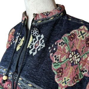 Gorgeous vintage Flashback boho jacket with intricate tapestry-style woven patterns in rich jewel tones on a black base. Features Southwestern and Aztec-inspired designs, a mandarin collar with drawstring ties, and unique carved button closures. Perfect statement piece for layering over dresses, jeans, or festival outfits.
