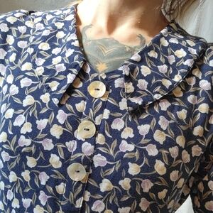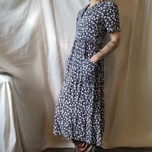 Notations Clothing Co. adorable floral midi dress. Two front pockets, seashell buttons, classic Peter Pan collar. Prairie cottagecore grannycite vibes! Fitted bodice with flowy skirt. Navy blue super soft rayon with multi colored floral print. So sweet and very comfortable. Labeled size small, true to size. Pictured on a size 0.
