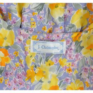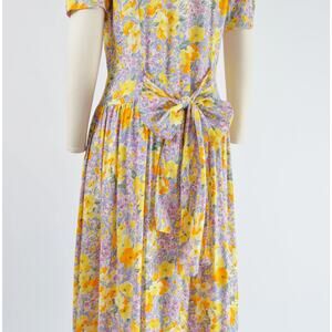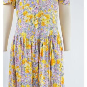 Vintage 1990's colorful botanical floral dress. Soft rayon crepe fabric. Loose fit. Ties at back waist. Drop waist. Gathered skirt. Side hip pockets. Puff sleeves. Button down front. Unlined.