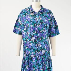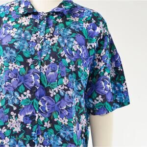 Vintage 1999's button front dress. Bold floral pattern featuring rich tones of deep violet, cobalt blue, teal, and white, all set against a black background.