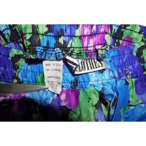• Vibrant abstract floral print in blue, purple, green, and black
