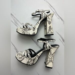 Throwback vintage 90s FormulaX platform heels in a bold snake print (black & white). Features a chunky 4.5” heel with platform for extra comfort and true retro style.