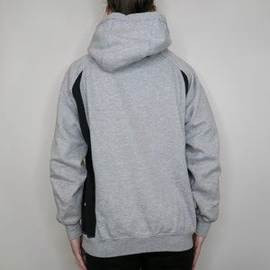 Game Sportswear. MIAA NCAA Division II school in Hays, Kansas. Two tone hoodie sweatshirt, gray with black on the sides, inside hood & on v stitch at neck. Chest reads “fhsu Tigers basketball” in yellow and black with a white swoosh around the text. Adjustable drawcord. Kangaroo pocket. Elastic cuffs & hem. Back is plain. 80% cotton & 20% polyester