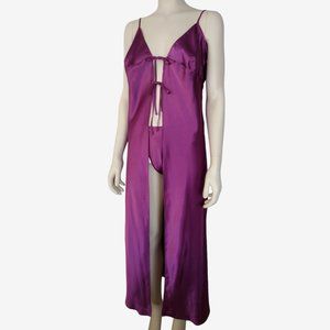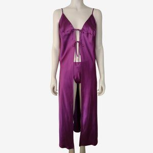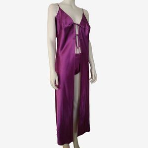 Vintage 1990s, sexy 2 piece set includes a robe, and matching g string panty. Made from purple 'mulberry' silky smooth satin fabric. The robe features a cleavage bearing, plunge neckline, and a 2 row front tie closure. The straps are length adjustable for a comfortable fit. Maxi length. The panty features a high waist, high leg fit. It ties at the side, and has a string thong back. Lightweight fabric. Machine washable.