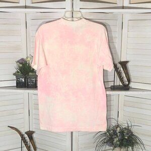 Vintage 90s single stitch T-shirt by Fruit of The Loom, made in the USA. Size Medium with a tie-dye design in light pink and cream.