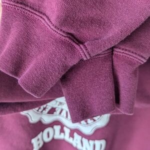 Vintage 1990s burgundy red crew neck Amsterdam sweatshirt from Fruit of the Loom. Long sleeves. Ribbed knit cuffs, collar and hem. White puffy print AMSTERDAM HOLLAND Eat. 1275 and the crest. Nineties true vintage. Normal wash wear. Machine washable. Clean. Unisex. No flaws.