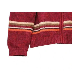 This vintage 90s full zip sweater is a must-have for any fashion-forward woman. The sweater features a striped pattern, long sleeves, and a collared neckline, making it perfect for a travel, party, or casual occasion. The sweater is made of a comfortable and breathable ramie and cotton knit fabric, which adds a touch of bohemian and autumnal vibe to the overall look. The sweater comes in a size large. It also features a full zip closure, which adds a classic and retro touch to the design. Perfect for the fall season, this sweater is a great addition to any wardrobe.