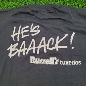 Vintage 90s Funny Cat Shirt L/XL 21x24 Black Russell Tuxedos The-Cat-is-Back
