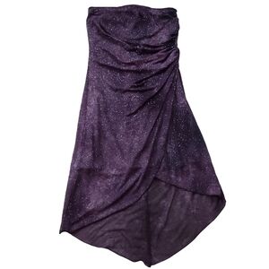 Vintage Punkie wear 90s Purple Galaxy Glitter Bling Strapless Dress Sz 9/10. rusched side, lined, mesh asymmetrical front, 100% polyester, dry clean, elastic band around the chest.