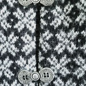 Clasp-front with Nordic-inspired knit pattern + cozy wool texture. Perfect for layering over turtlenecks, crisp button-downs, or styled alone for that 90s minimalist vibe. A timeless piece, perfect for winter holidays.