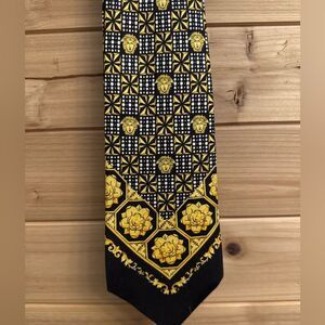 Black & Yellow Gold Checkered Medusa Head Pattern Silk Tie No Flaws Or Stains Seen