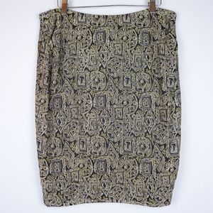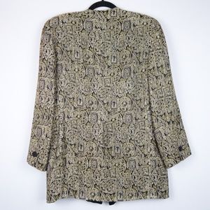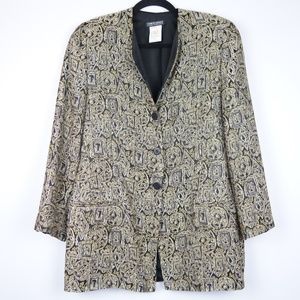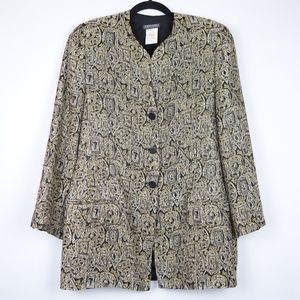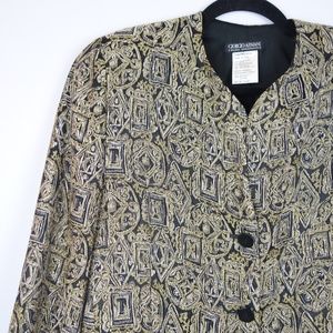 Vintage 1990’s Giorgio Armani geometric embroidered print collarless jacket with shoulder pads and skirt set featuring black, silver-tone, gold-tone, silk blend fabric made in Italy.