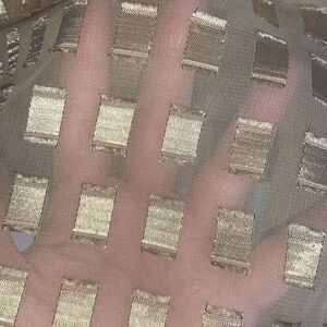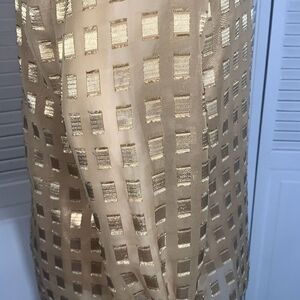 Notations clothing company. 100% polyester. Made in Indonesia. Sheer, gold, shimmer, geometric block, rectangle, all over satin detailed. Matching sleeveless tank top matching two piece set. Excellent vintage condition. Both pieces women’s medium.