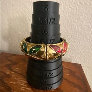 EUC excellent Vintage 90s Gold Tone Green & Red Hinged Clamper Bracelet fits 6.5” to 7” inch wrist gold tone alloy and green & red enamel magnetic close