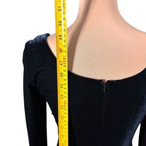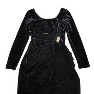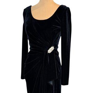 Vintage 90s Gothic Black Velvet Midi Dress Sz 6 Ruching Brooch Event Formal