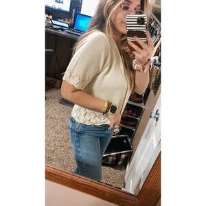 Tags: vintage top neutral cream knit Handknit 90s 80s button front relaxed fit office work trendy fashion business school geometric laser cut granny grandmacore coastal granny coastal grandma trendy cottagecore