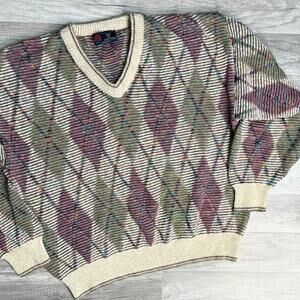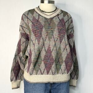 Cozy up in this vintage gem from Isle of Cotton, made right here in the USA. knit sweater with a bold abstract diamond pattern in earthy mauve, olive, and cream tones, plus colorful speckled threads throughout. Has a slouchy, oversized fit—perfect for that effortlessly cool retro vibe.