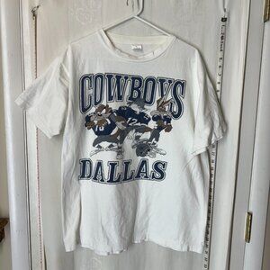 Vintage 90's Graphic T-shirt - Cowboys as Bugs - 12 (Staubach perhaps), Taz - 78 and Wiley E. with 43. Print faded and small holes by the shoulder. 100% cotton, made in the Dominican Republic. Pit to pit - 22, back collar to hem - 27.
