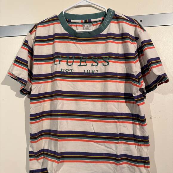 Vintage 90s Guess Originals T-Shirt, Multi-Color Striped, Men's Size M — Classic Streetwear. This iconic piece features vibrant horizontal stripes in orange, purple, and green on an off-white base. The front center displays heavy embroidery with 'GUESS EST. 1981'. The ribbed crew neck includes subtle 'GUESS' text detailing. Good pre-owned vintage condition with minor signs of wear consistent with age. No major holes or stains. Approximate measurements: Pit-to-pit 21 inches, Length 24.5 inches. Perfect for a retro Y2K or 90s aesthetic.