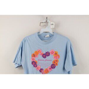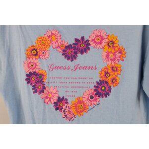 Vintage 90s Guess Womens Medium Faded Spell Out Heart Flower T-Shirt Blue USA