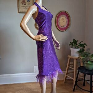 Vintage 90s Gunne Sax Sequin Midi Dress Purple Ostrich Feathers Siren Size 5/6
