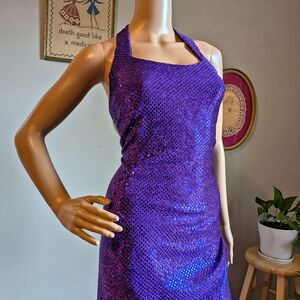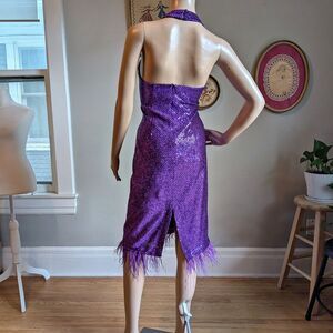Vintage 1990s Jessica McClintock Gunne Sax purple sequin midi dress. Sequin fabric. Halter top, sleeveless. Zip up back with slit. Lined. Purple ostrich feathers on trim, not original to garment - exposed stitching inside hem. Dress is in good vintage condition with light wear including possible missing sequins and loose threads.