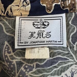 This lovely vintage ‘90s HMS by Jonathan Martin navy blue lightweight blazer features a cropped single breasted cut, allover floral print, shoulder pads, and wood buttons. The material is lightweight, making it a perfect spring transition piece.