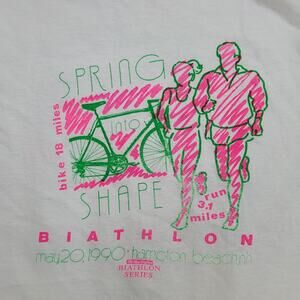VINTAGE 90S BIATHLON TEE XS WHITE, HAMPTON BEACH MARATHON SHIRT 1990, SPRING INTO SHAPE BIKE RUN TEE, SINGLE STITCH 90S COTTON POLY TEE, NEON GRAPHIC BIKE RUN SHIRT SMALL, VINTAGE TEE, MARATHON SHIRT, SINGLE STITCH, BIKE RUN, 90S GRAPHIC