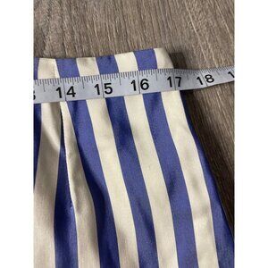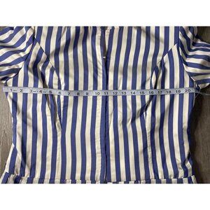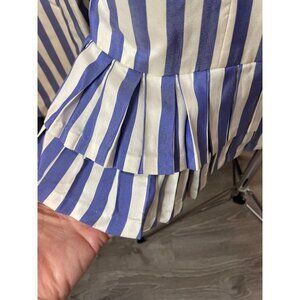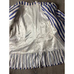 This complete set of Vintage 90s Handmade Blue White Vertical Stripe Skirt and Jacket Size M is a unique addition to your wardrobe. The set exudes classic charm and effortless style with its timeless design and color scheme.